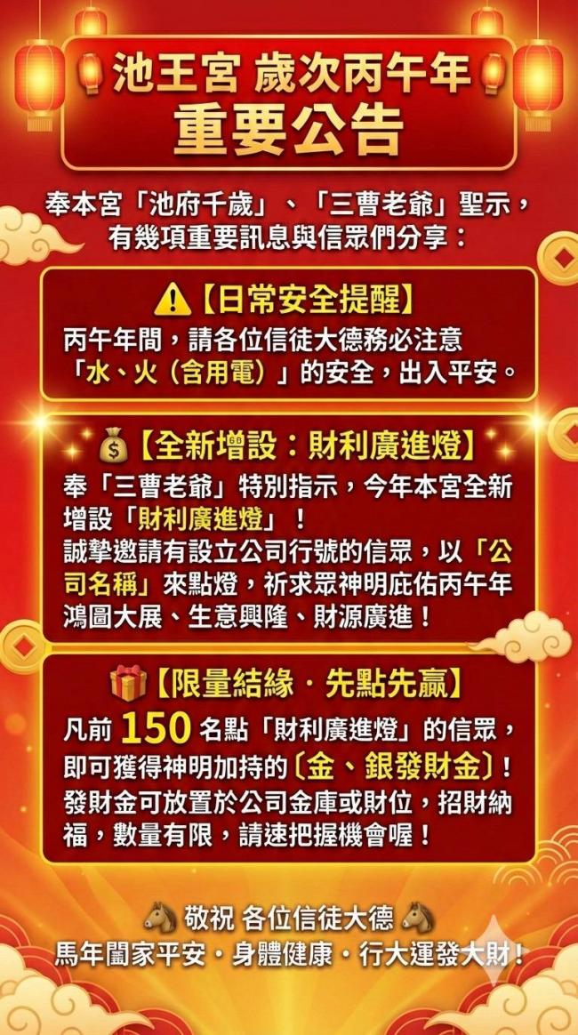 歲次丙午年,為護佑信徒大德闔家平安、流年順遂,特公告重要事項如下:
